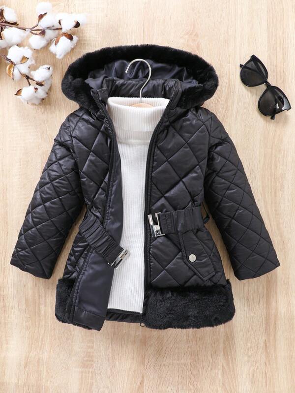 Young Girl 1pc Hooded Quilted Belted Coat