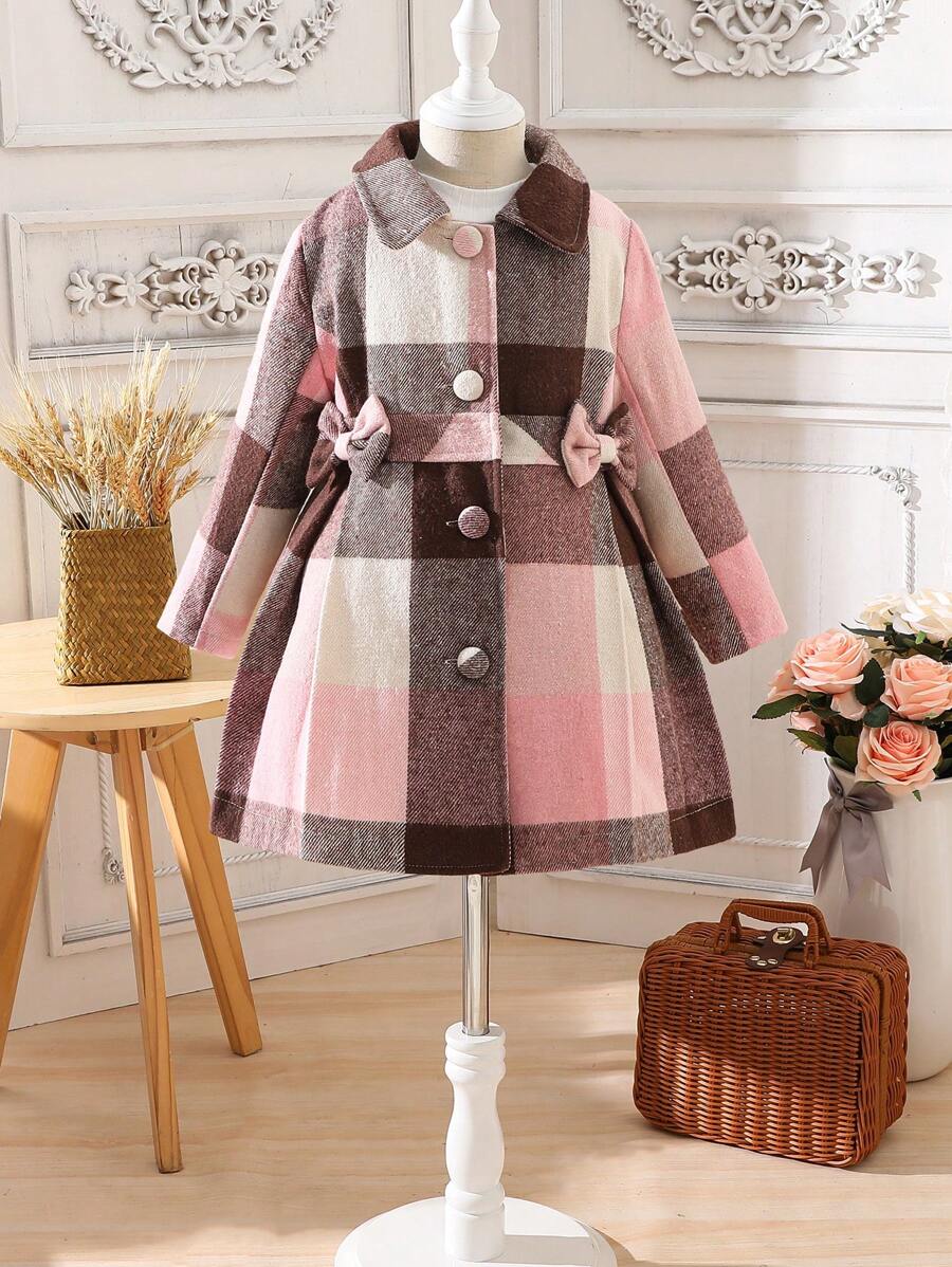 Young Girl 1pc Plaid Print Bow Front Overcoat