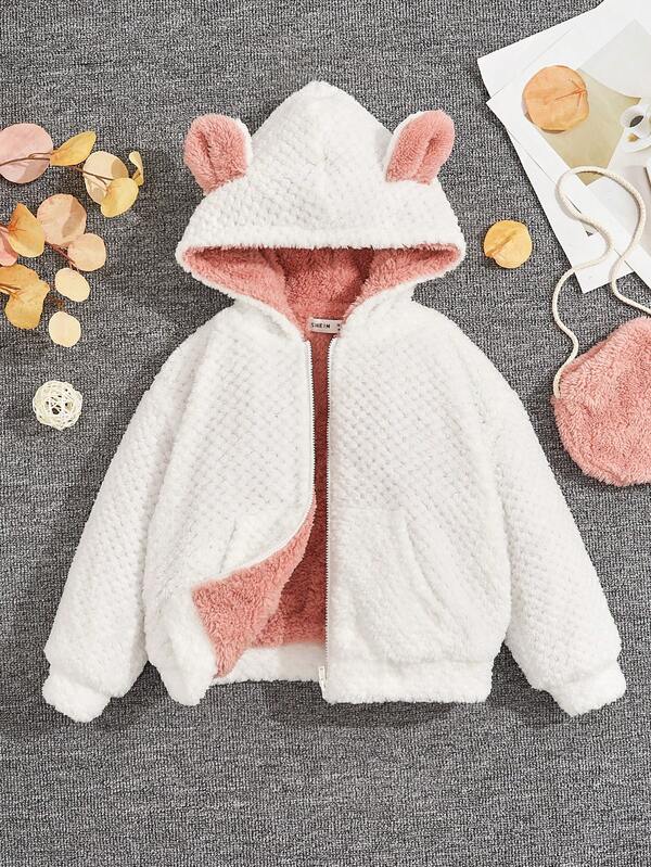 SHEIN Young Girl 3D Ears Design Hooded Teddy Jacket With Bag