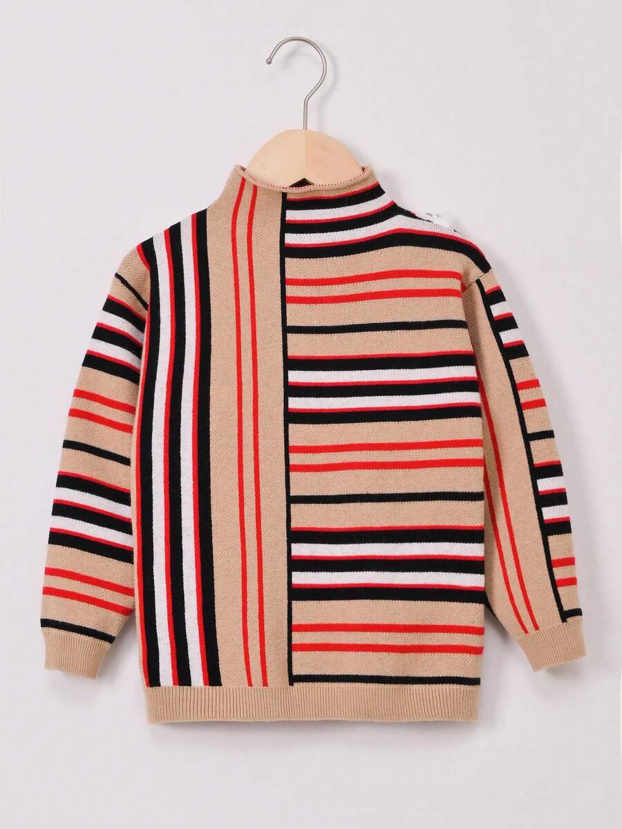 Young Girl Block Striped Pattern Mock Neck Sweater