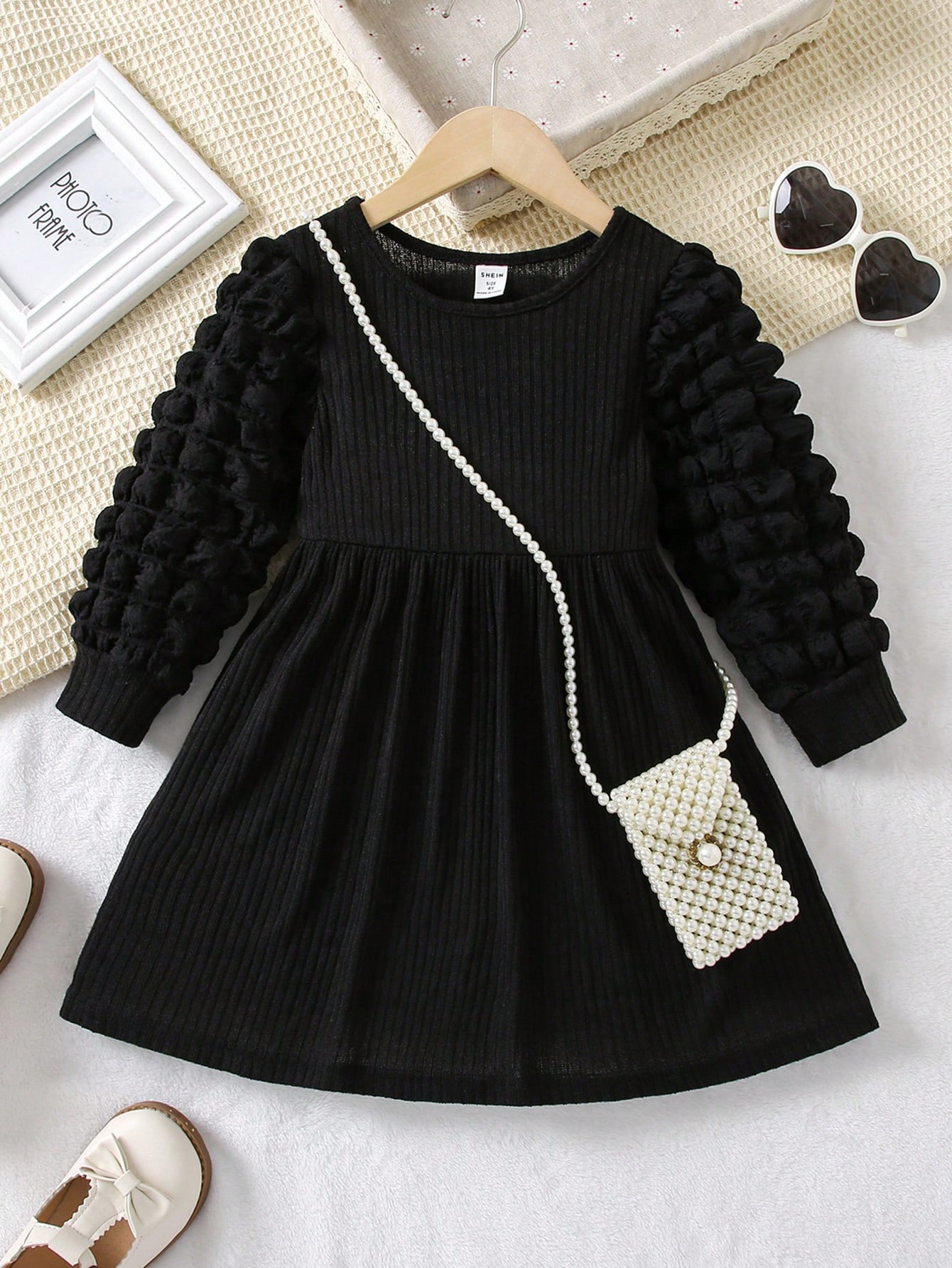 Young Girl Bubble Sleeves Black Dress For Autumn