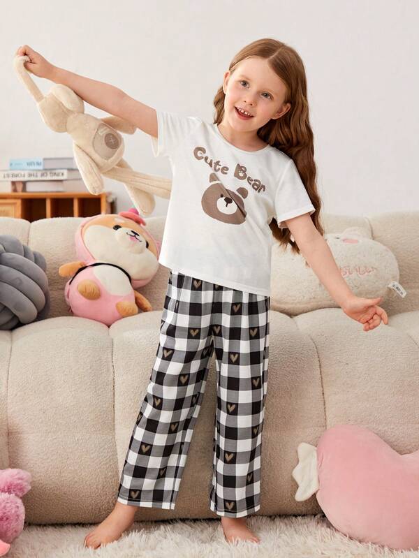 SHEIN Young Girl Cartoon & Letter Graphic Tee & Plaid Pants PJ Set