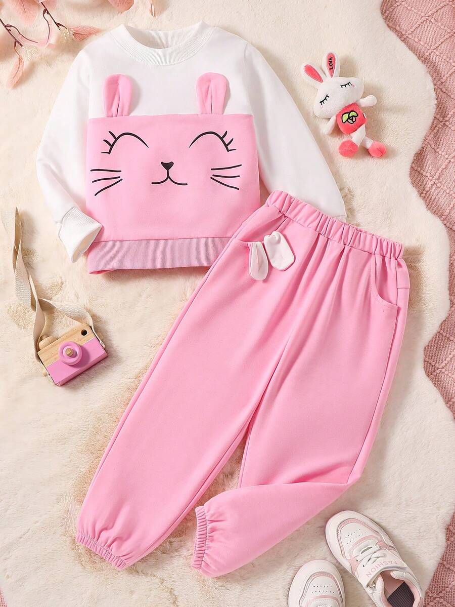 Young Girl Cartoon Graphic 3D Ear Design Sweatshirt & Sweatpants