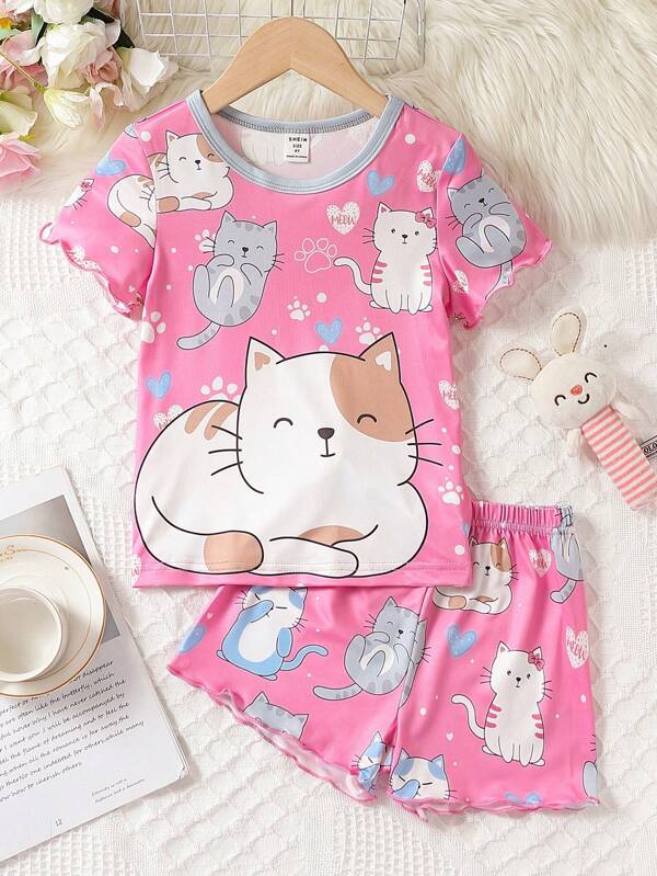 Young Girl Cartoon Graphic Contrast Binding PJ Set