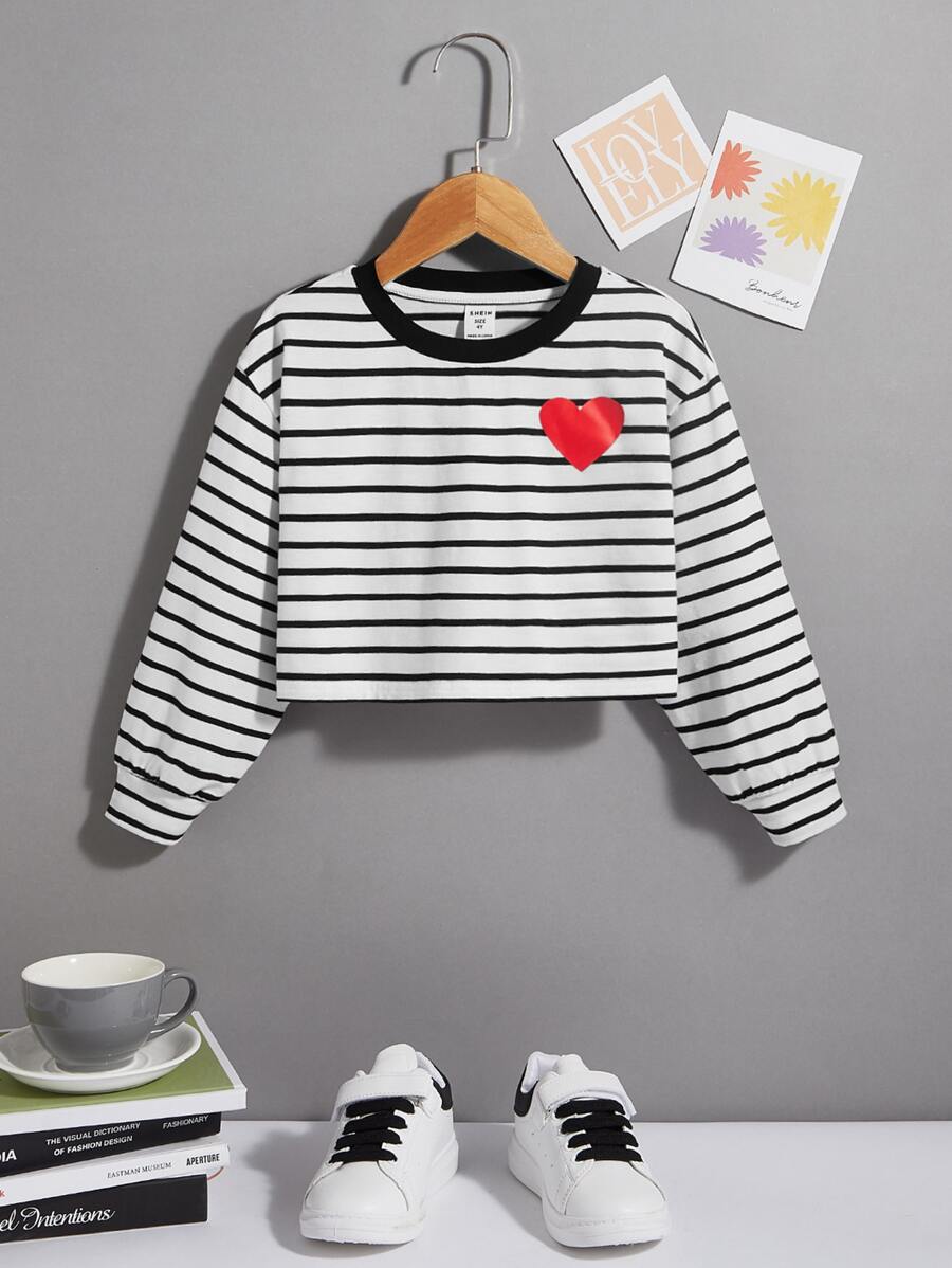SHEIN Kids EVRYDAY Young Girl Casual Knit Soft Heart Design Round Neck Drop Shoulder Striped Long Sleeve Pullover Sweater