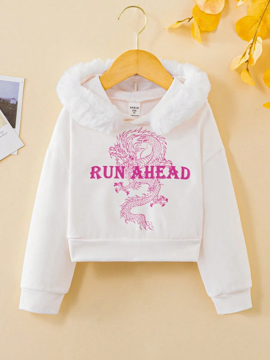 Young Girl Chinese Dragon & Letter Graphic Fuzzy Trim Thermal Lined Hoodie