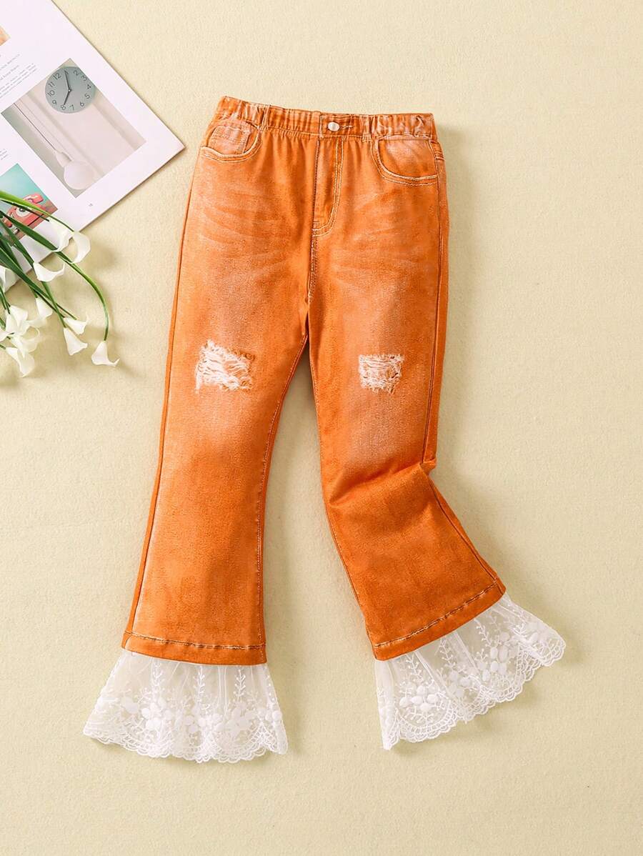 Young Girl Denim Effect Contrast Lace Hem Flare Leg Pants