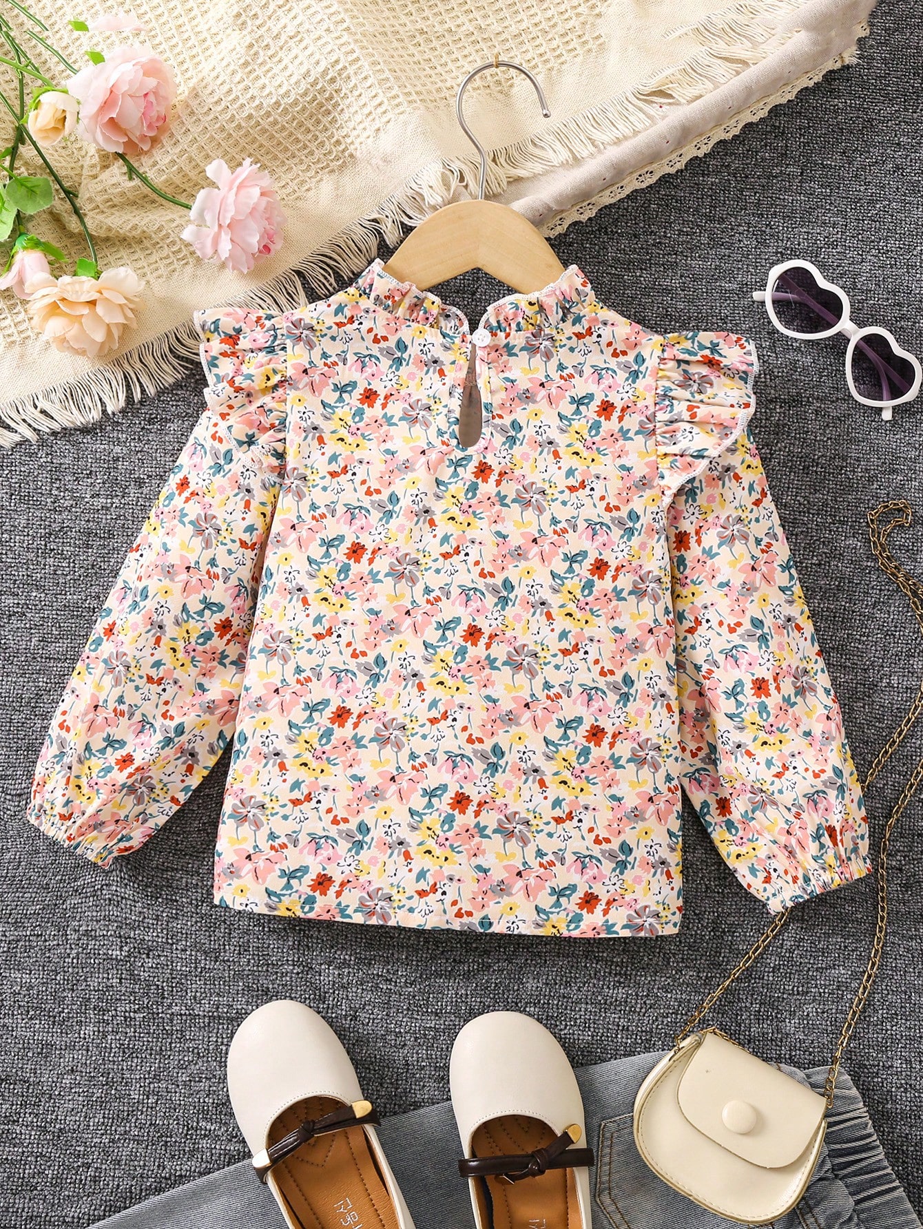 SHEIN Kids Academe Young Girl Ditsy Floral Print Ruffle Trim Mock Neck Lantern Sleeve Blouse