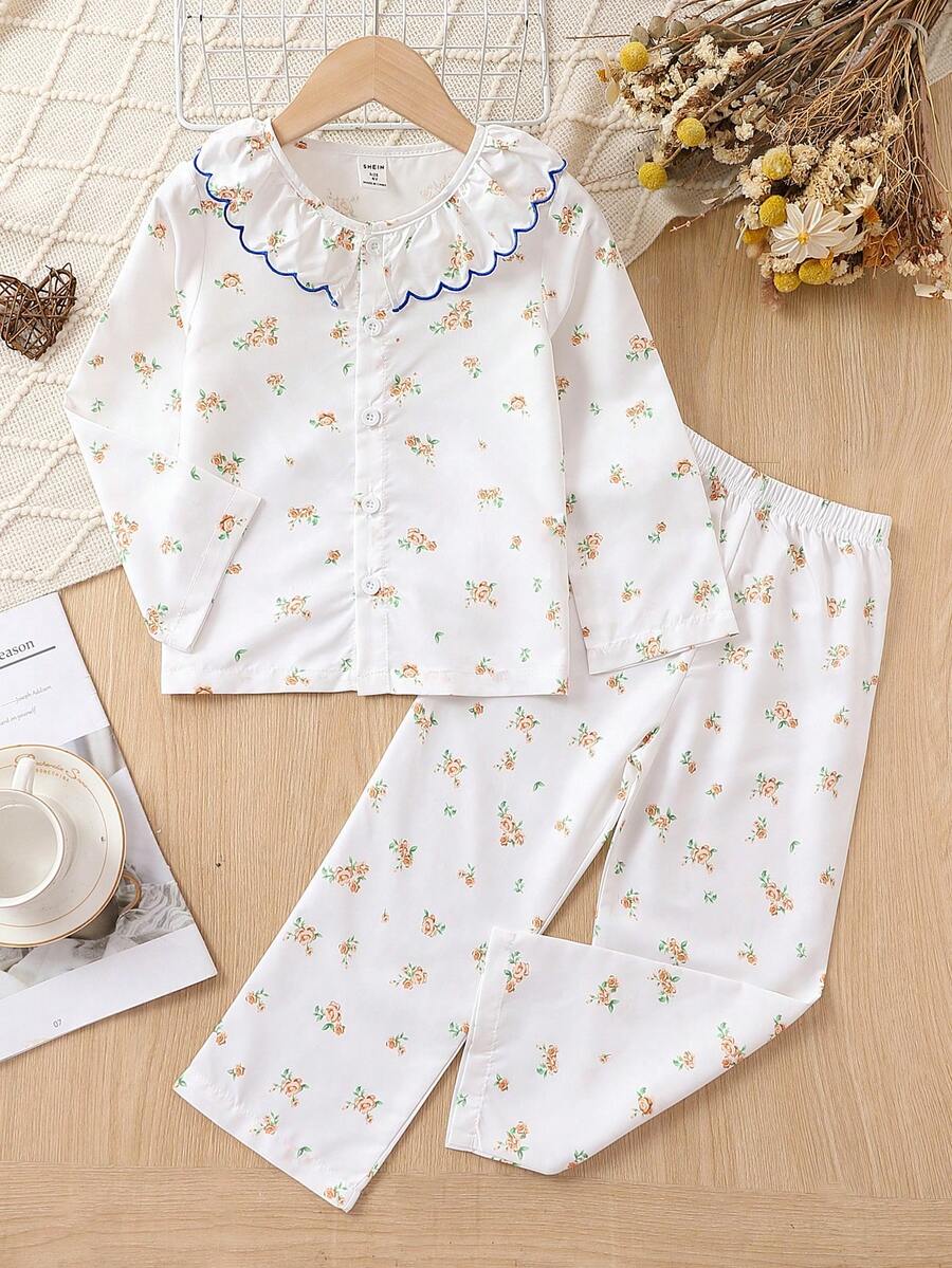Young Girl Ditsy Floral Print Ruffle Trim PJ Set