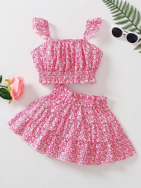 Young Girl Ditsy Floral Print Ruffle Trim Top & Paperbag Waist Skirt
