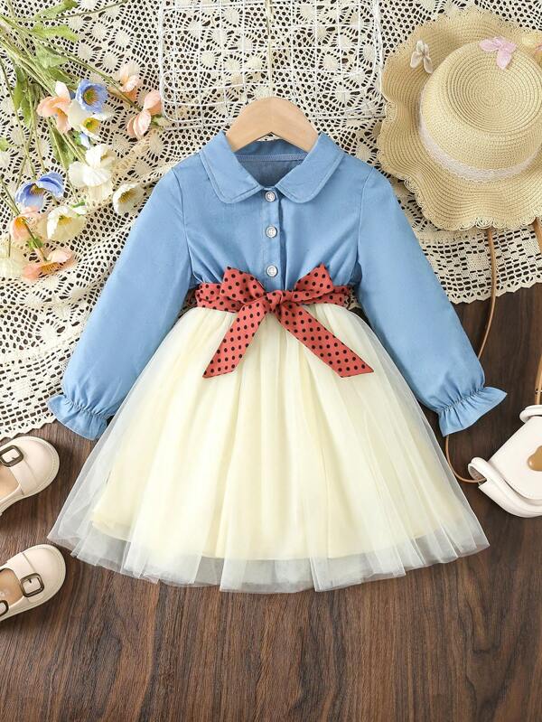 Young Girl Elegant Princess Style Denim & Mesh Splice Dress With Polka Dot Belt