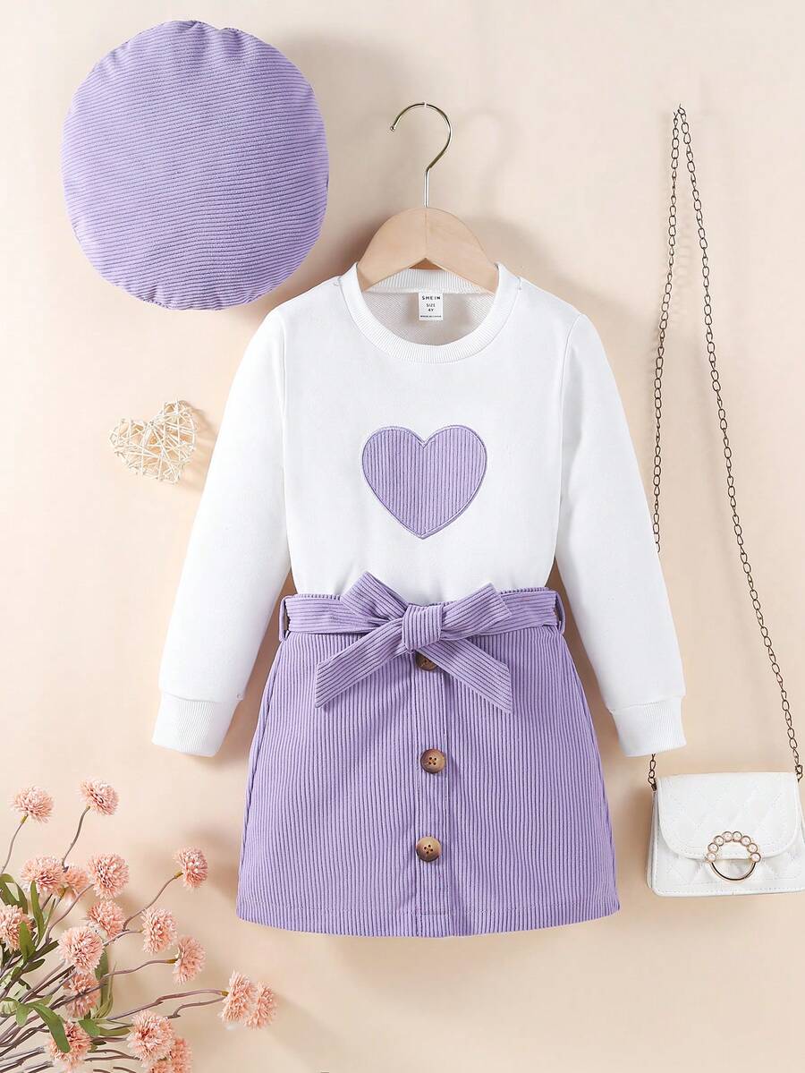 SHEIN Kids EVRYDAY Young Girl Embroidery Heart Pattern Tee & Belted Skirt & Hat