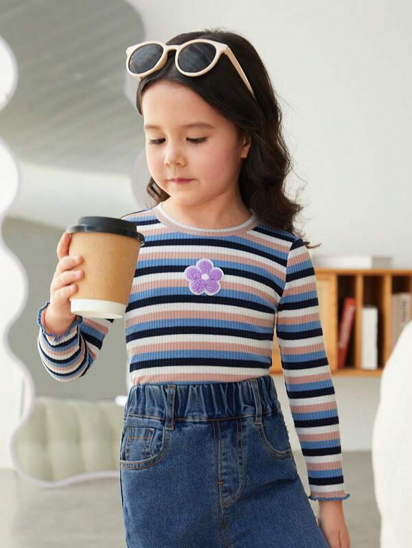 SHEIN Kids Y2Kool Young Girl Floral Patched Striped Print Tee