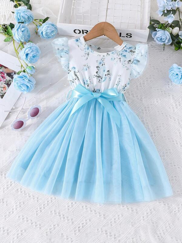 Young Girl Floral Print Ruffle Trim Mesh Hem Dress