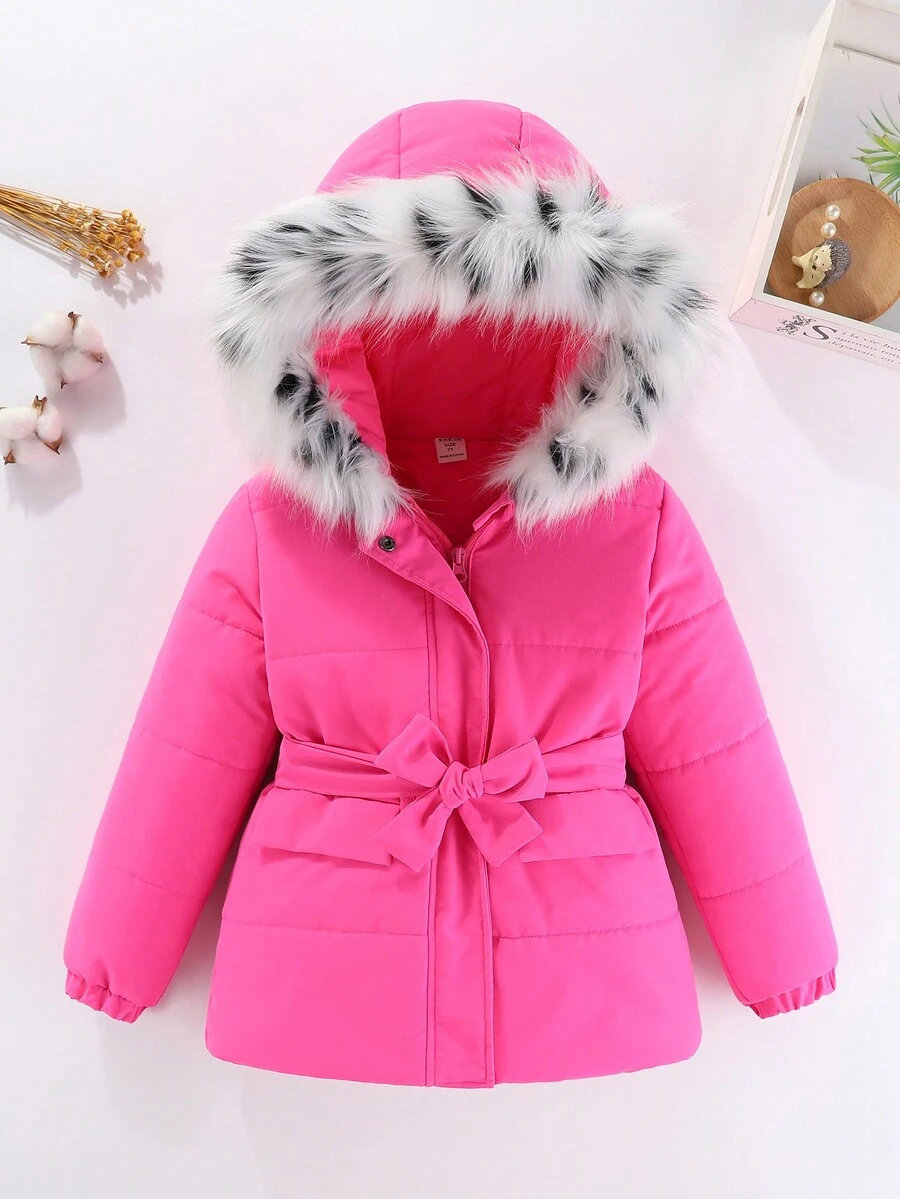 Young Girl Fuzzy Trim Hooded Belted Puffer Coat