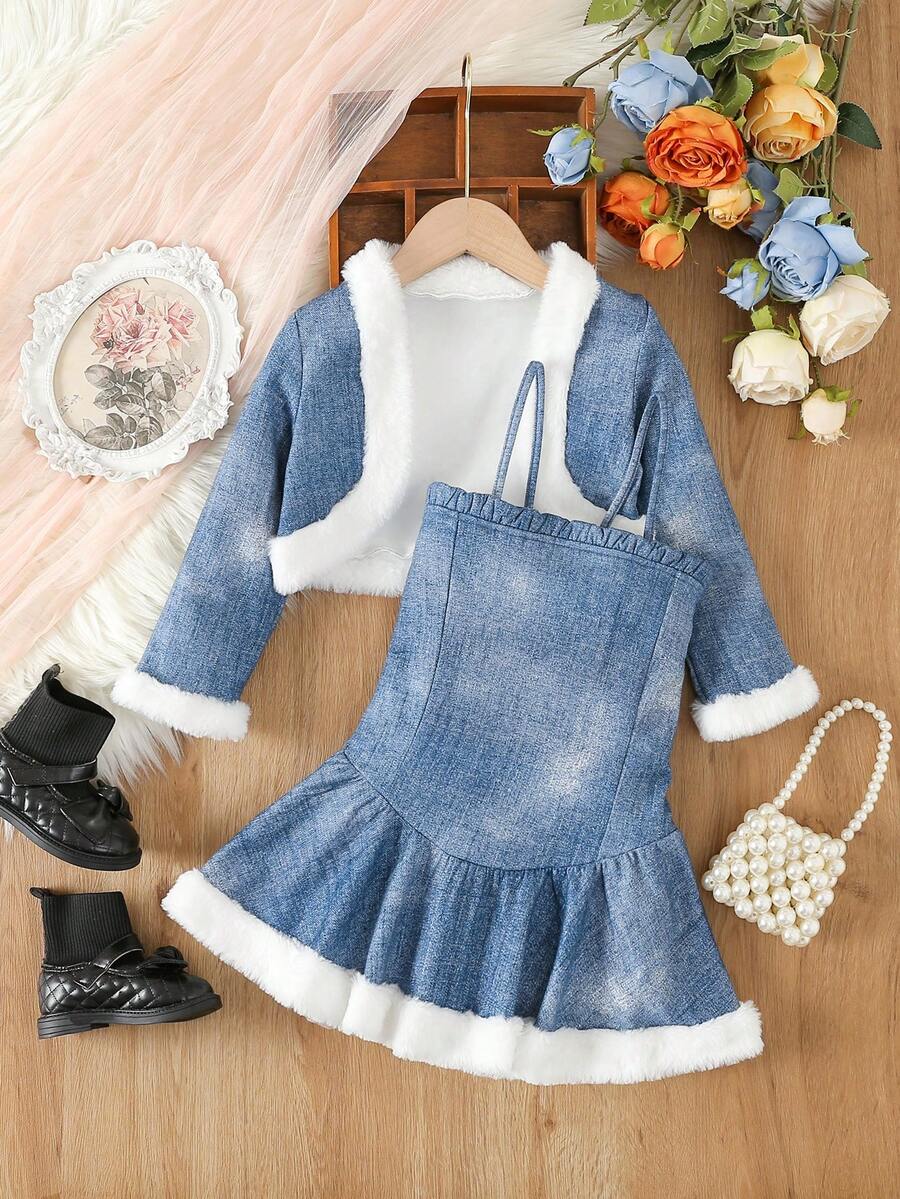 Young Girl Fuzzy Trim Jacket & Ruffle Hem Cami Dress