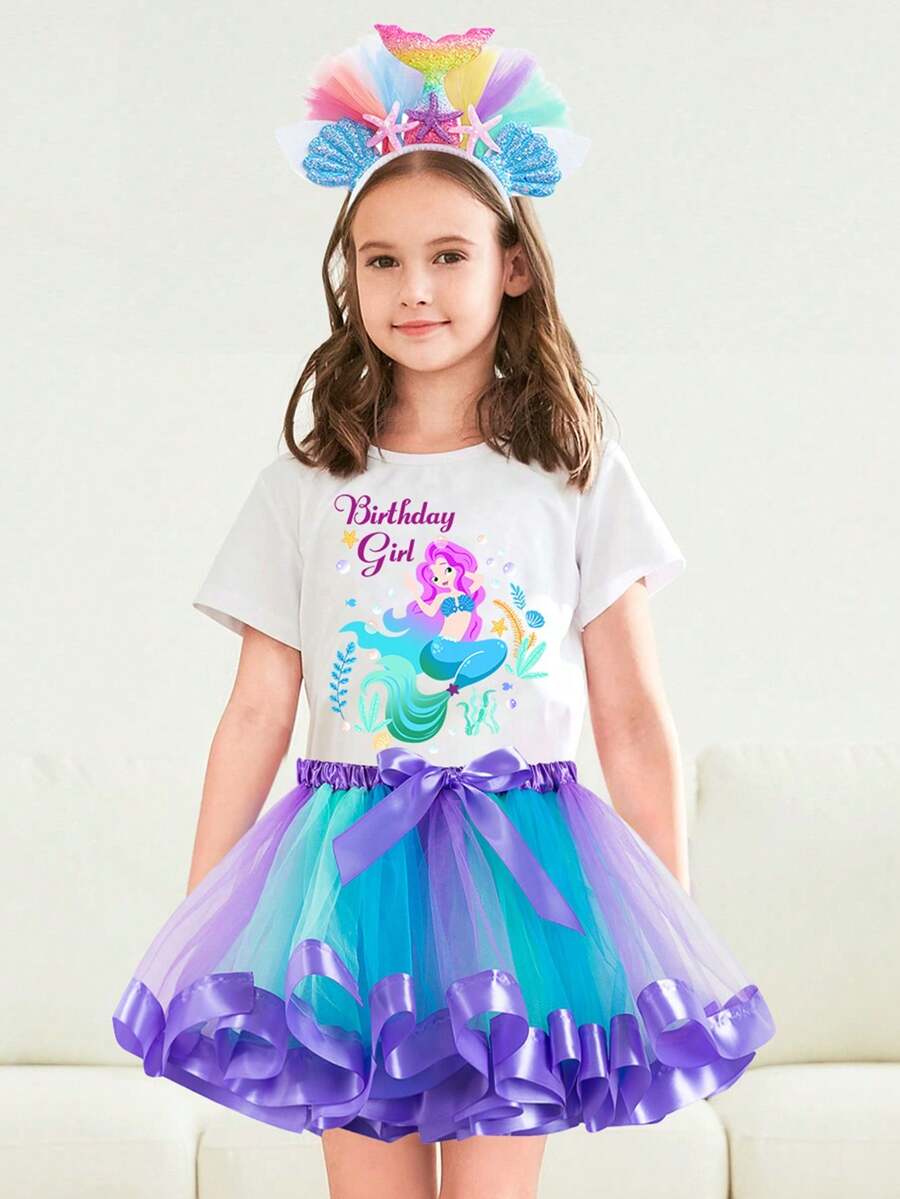 Young Girl Happy Birthday T-Shirt And Blue Mesh Skirt Set, Includes Headband And Satin Sash