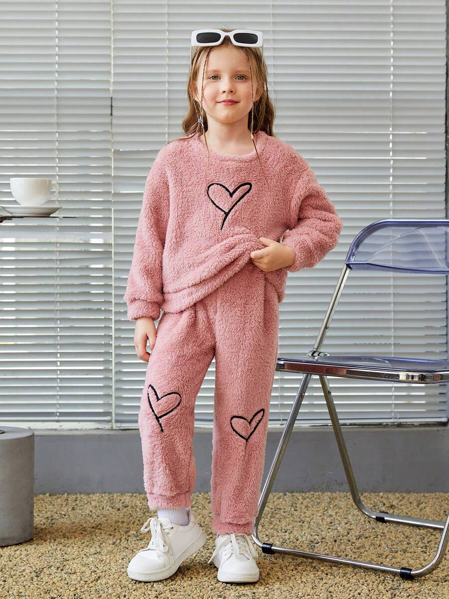 SHEIN Young Girl Heart Embroidery Drop Shoulder Teddy Sweatshirt & Pants