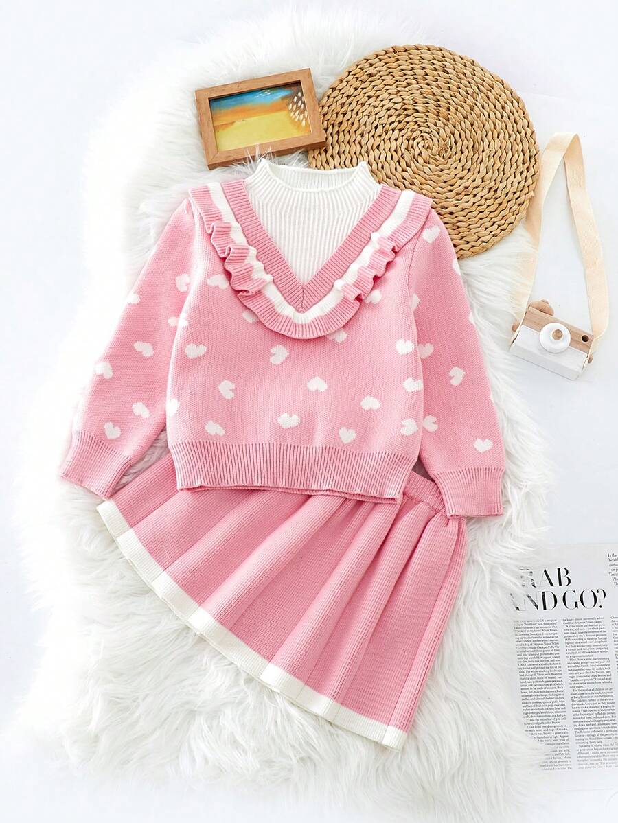 SHEIN Kids Nujoom Young Girl Heart Pattern Ruffle Trim 2 In 1 Sweater & Knit Skirt