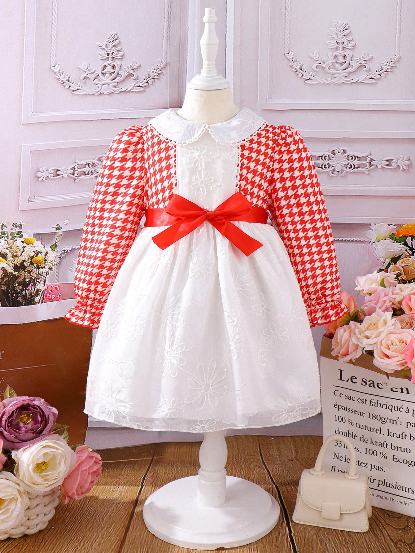 Young Girl Houndstooth Print Peter Pan Collar Flare Sleeve Belted Dress