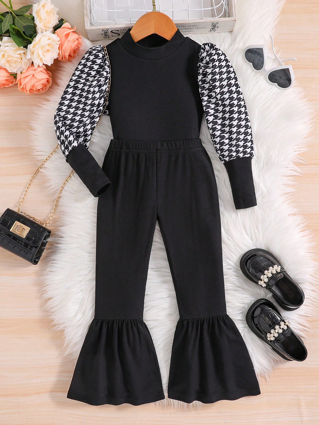 Young Girl Houndstooth Print Puff Sleeve Tee & Flare Leg Pants