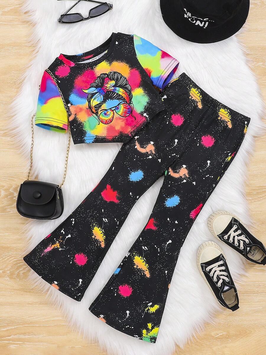 SHEIN Young Girl Knitted Loose Fit Top With Girl Print And Knitted Graffiti Flare Leg Pants Two Piece Set
