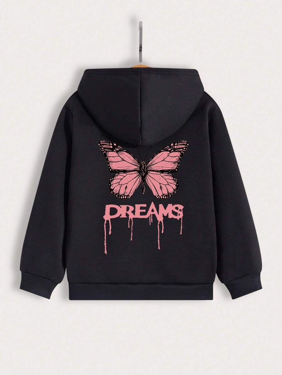 Young Girl Letter & Butterfly Print Thermal Hoodie