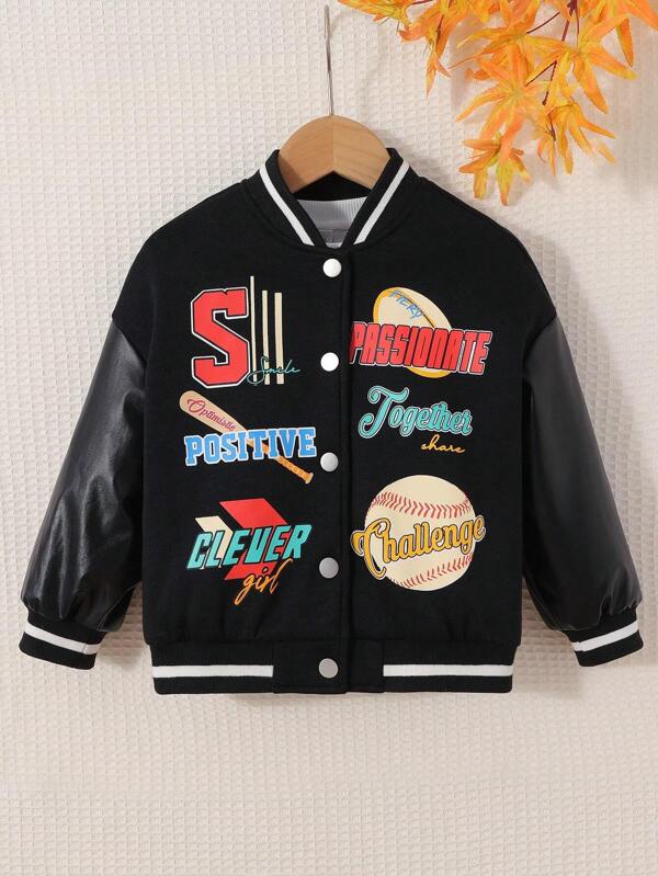 SHEIN Young Girl Letter Graphic Drop Shoulder Striped Trim Varsity Jacket