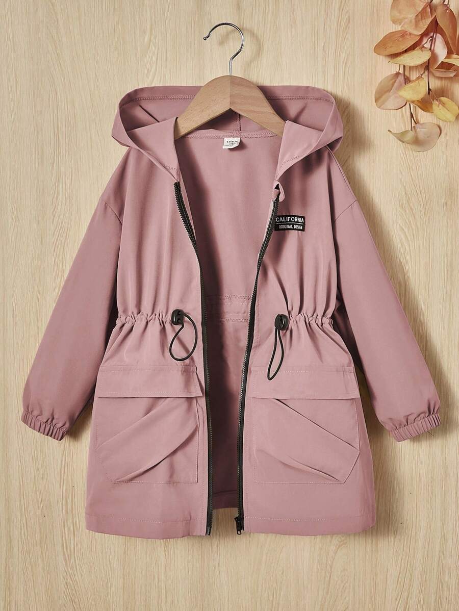 SHEIN Young Girl Letter Patched Detail Drawstring Waist Flap Pocket Hooded Coat