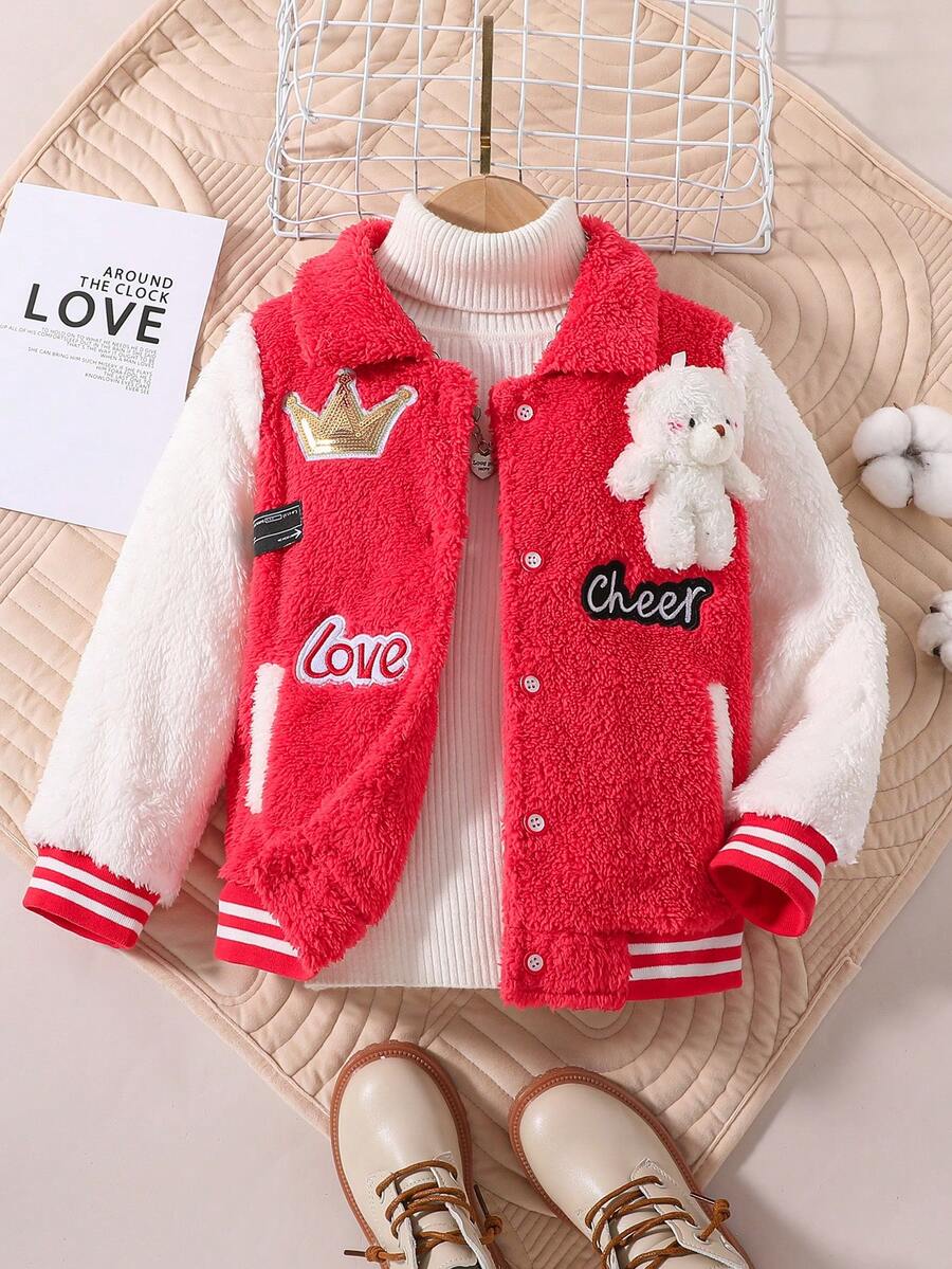 Young Girl Letter Patched Striped Trim Teddy Jacket Without Sweater