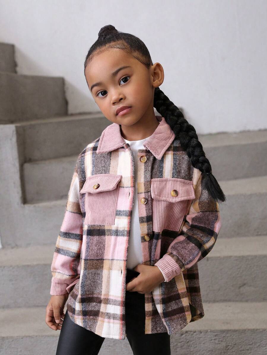 SHEIN Kids Cooltwn Young Girl Plaid Flap Pocket Drop Shoulder Overcoat