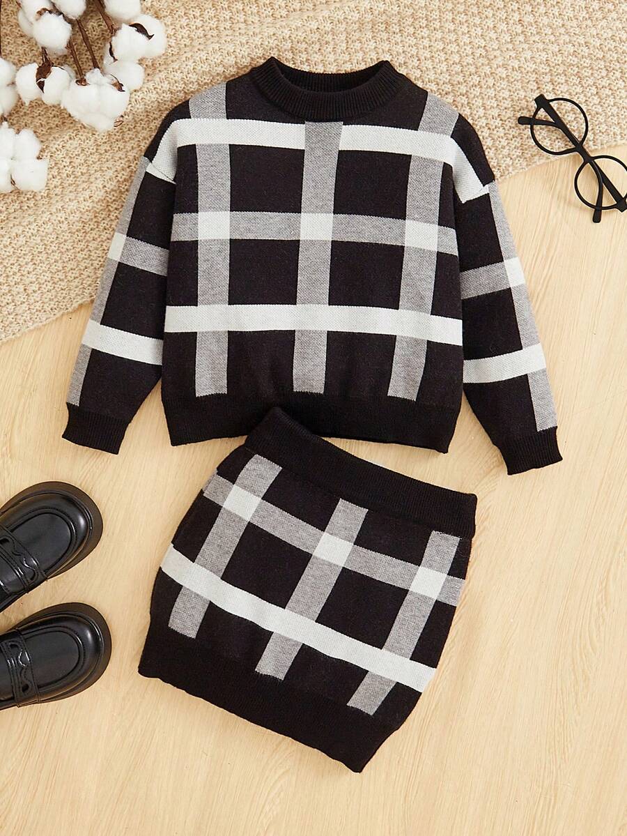 SHEIN Young Girl Plaid Pattern Sweater & Knit Skirt
