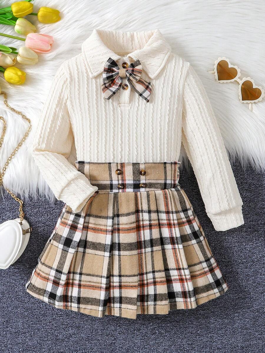 Young Girl Plaid Print Bow Front Polo Neck Tee & Pleated Skirt