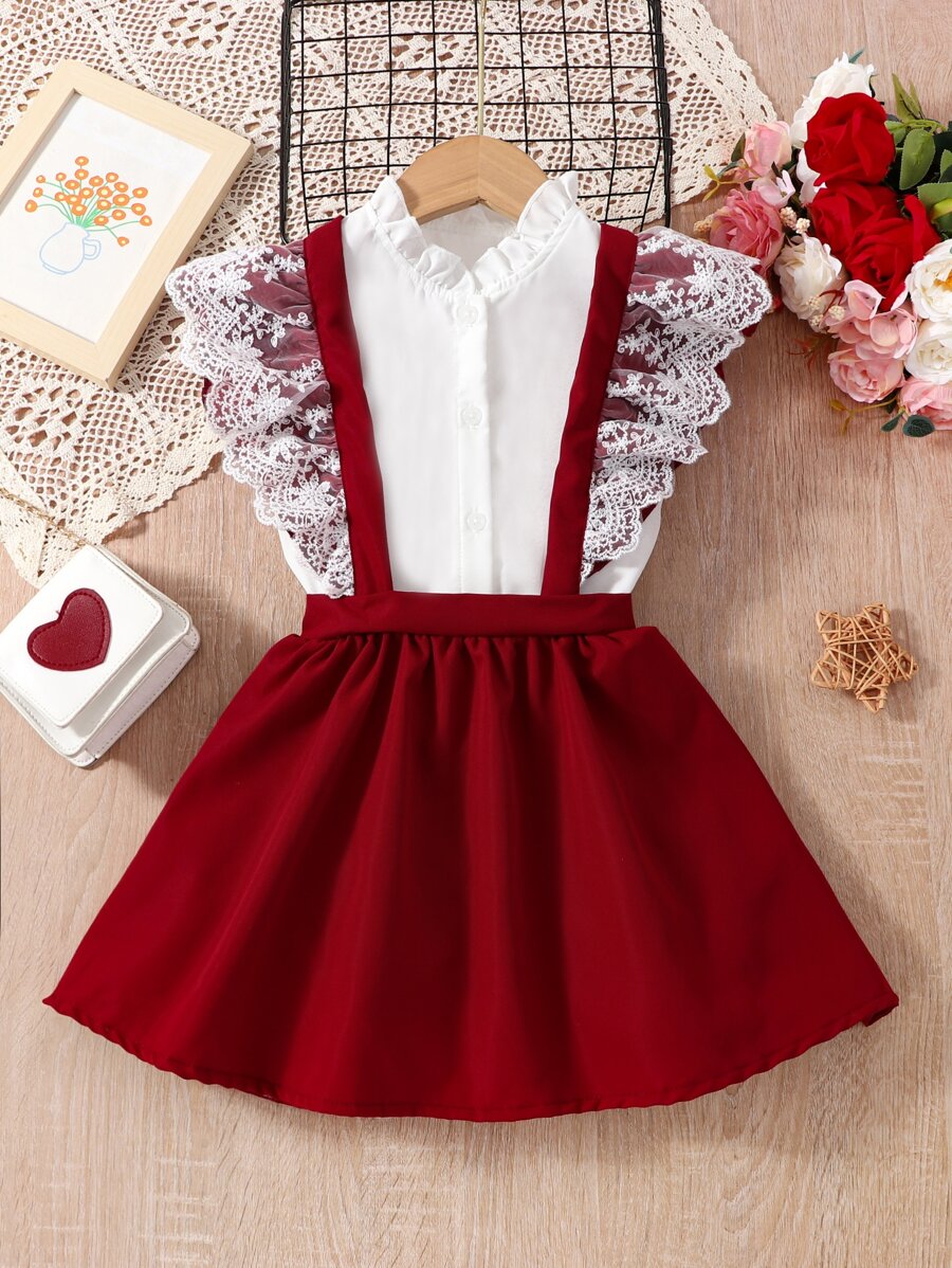 SHEIN Kids SUNSHNE Young Girl Red & White Colorblock Romantic Elegant Vintage Style Short Sleeve Top & Skirt Set For Summer