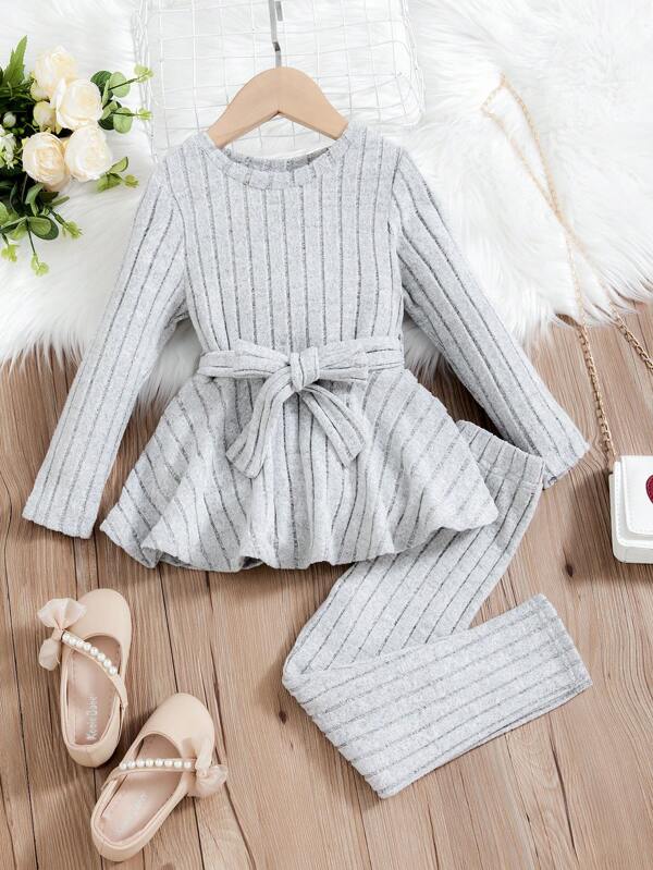 Young Girl Ribbed Knit Peplum Belted Tee & Leggings