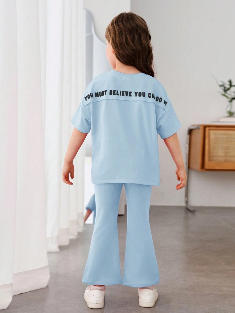 SHEIN Young Girl Slogan Graphic Drop Shoulder Tee & Flare Leg Pants