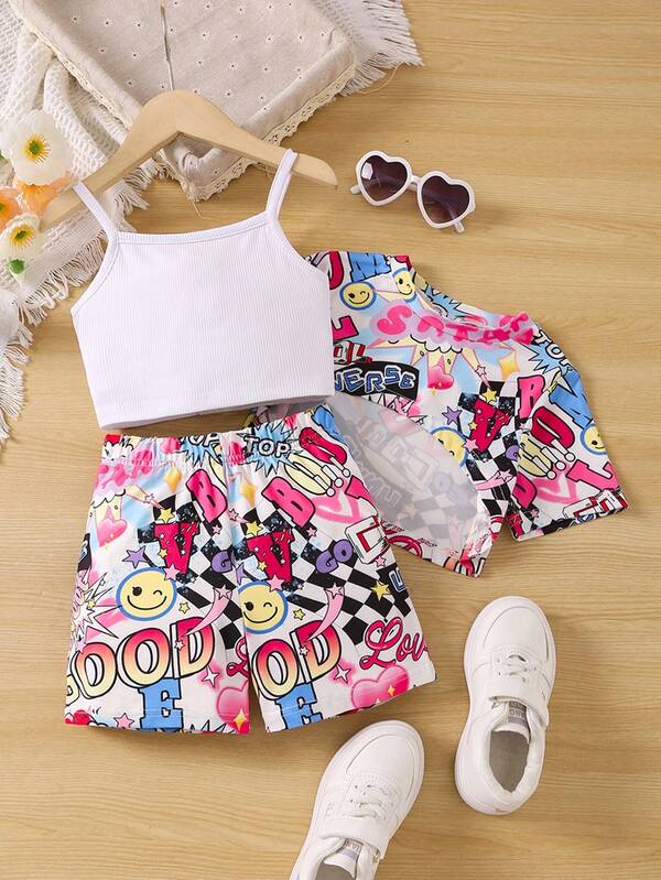 Young Girl Solid Cami Top & Cartoon Graphic Shorts & Tee