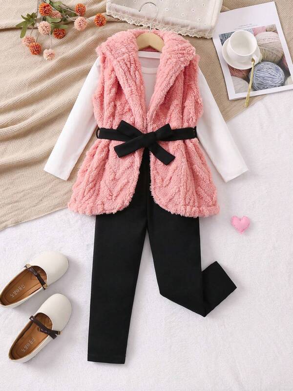 Young Girl Solid Tee & Pants & Fuzzy Belted Vest Coat