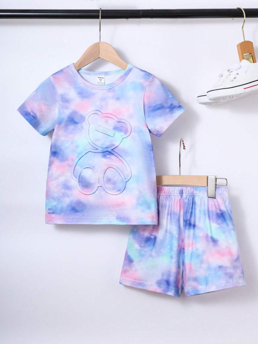 SHEIN Kids EVRYDAY Young Girl Tie Dye Bear Print Tee & Shorts