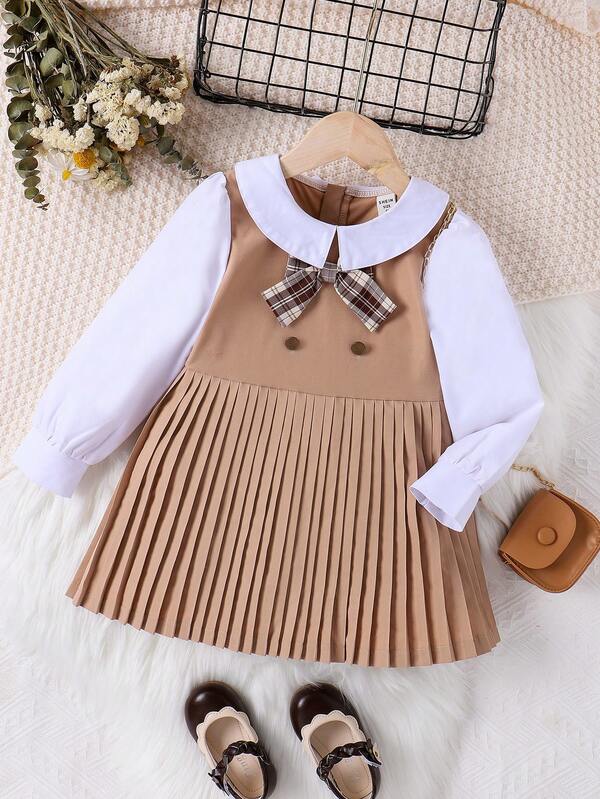 Young Girl Two Tone Bow Front Pleated Hem 2 In 1 Dress