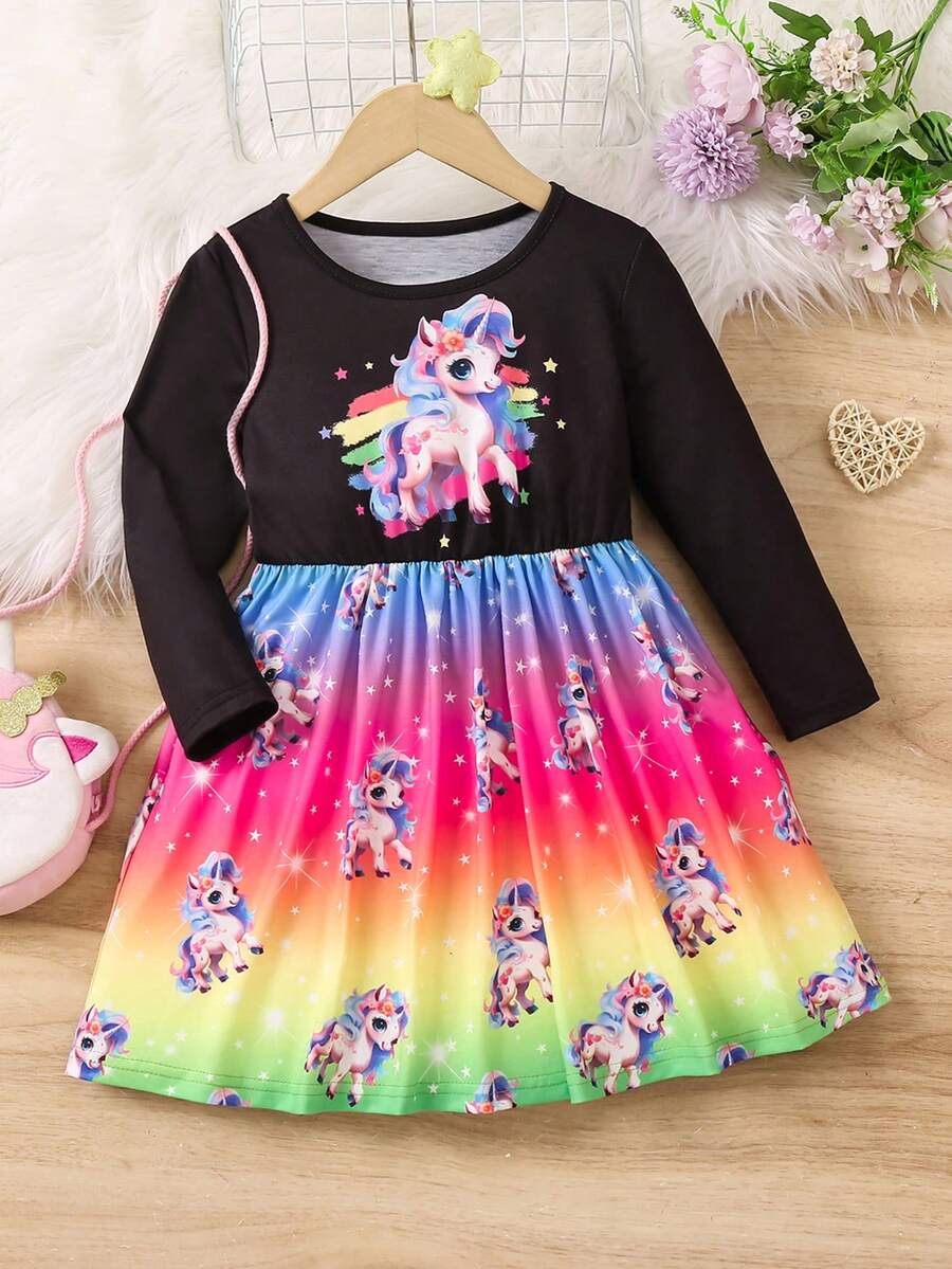 SHEIN Kids KDOMO Young Girl Unicorn Print Ombre Dress
