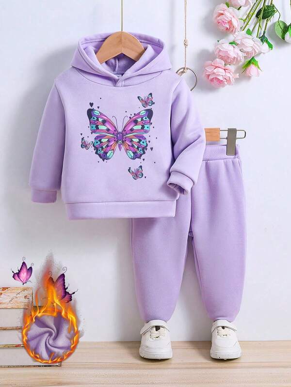 Young Girls' Butterfly Pattern Printed Warm Hoodie And Sports Pants