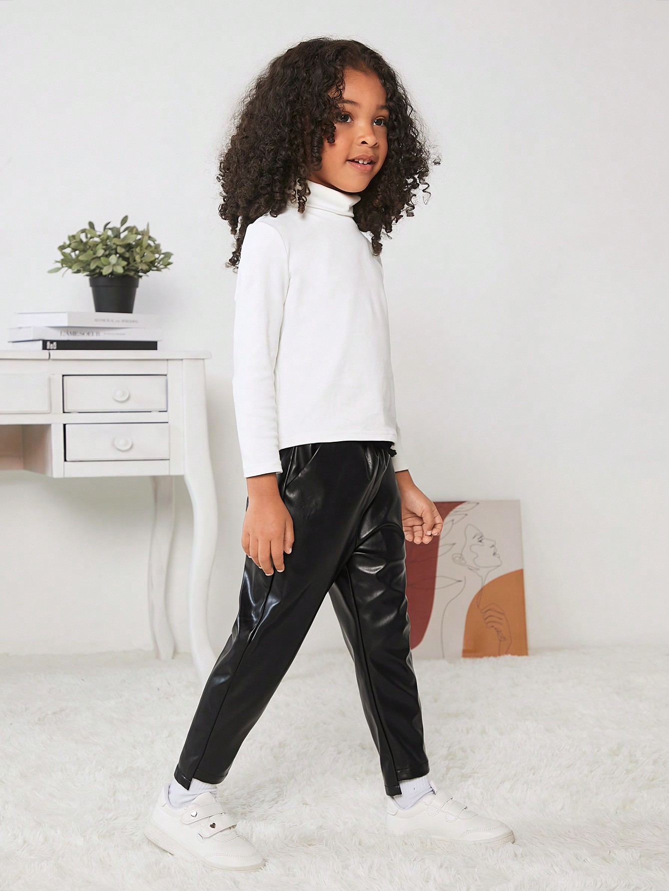 SHEIN Kids Cooltwn Young Girls' Casual Sports Pu Leather Solid Color Long Pants