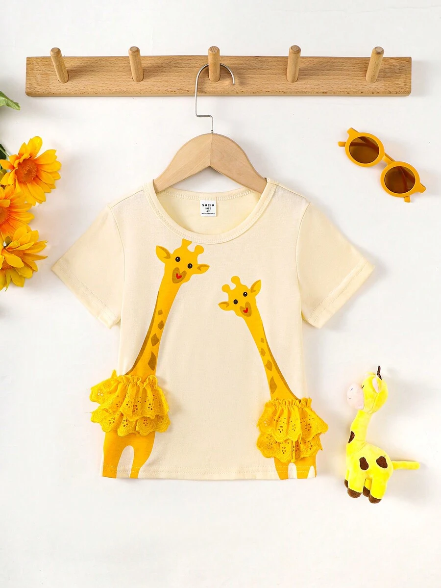 SHEIN Kids EVRYDAY Young Girls' Giraffe Print Short Sleeve T-Shirt