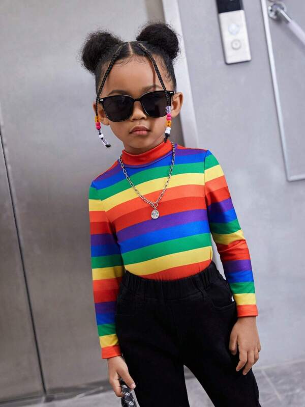 SHEIN Kids Cooltwn Young Girls' Rainbow Striped Long Sleeve Knitted T-Shirt With Stand Collar For Fall/Winter
