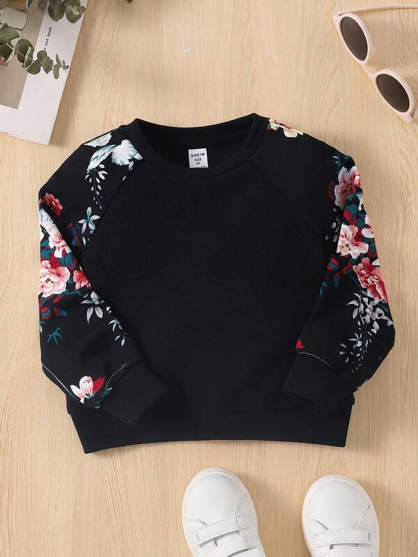 SHEIN Kids Cooltwn Young Girls' Urban Elegant Knit Round Neck Floral Print Patchwork Pullover Sweatshirt