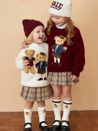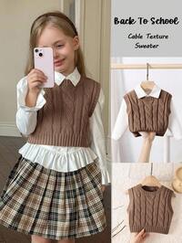 VibeCozSHEIN Young Girl Ribbed Knit Sweater Vest With Cable Texture, Elegant & Cute, High Quality, Warm & Soft, Versatile For Play, Daily Wear, School, Autumn & Winter,Pairing White Shirt,Back To School Season.College Style, 2025 New Princess Style Girls Sweater, Round Neck Embroidered Knit Top, Suitable For 4-7 Years Old, Suitable For Spring, Autumn, Winter, Suitable For Campus Daily Wear, Suitable For Home Leisure, Outdoor Travel, Family Gathering, Children's Park Games Autumn And Winter Young Girls Dressse