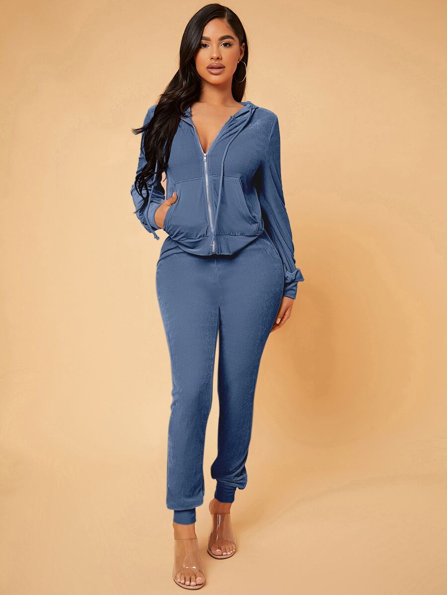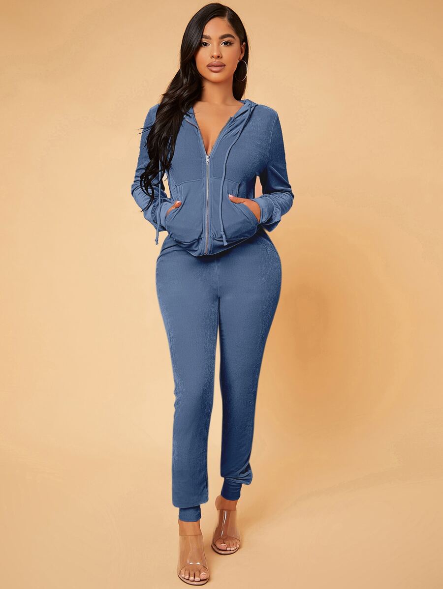 SHEIN SXY Zip Up Drawstring Hooded Velvet Jacket & Sweatpants