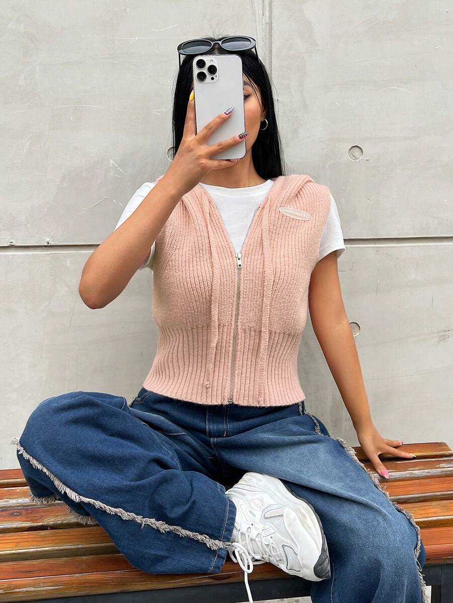 SHEIN EZwear Zip Up Hooded Sweater Vest Without Tee