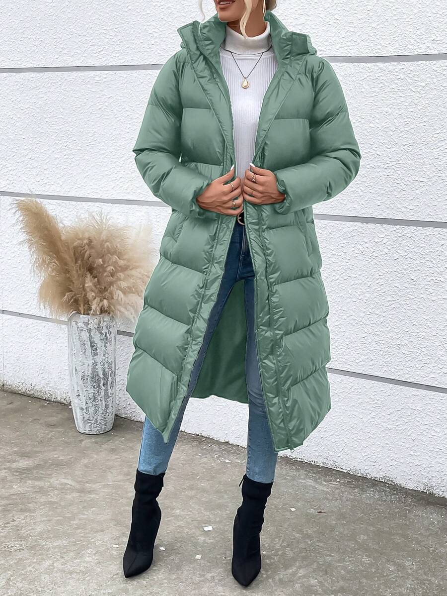 SHEIN LUNE Zipper Closure Hooded Puffer Coat With Waist Belt